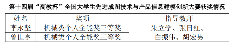 第十四届“高教杯”全国大学生先进成图技术与产品信息建模创新大赛近日成功举行,我校3044am永利集团官网的李永坚、曾世亨2位同学经过激烈角逐,分别获得本届全国总决赛的机械类个人全能奖三等奖。