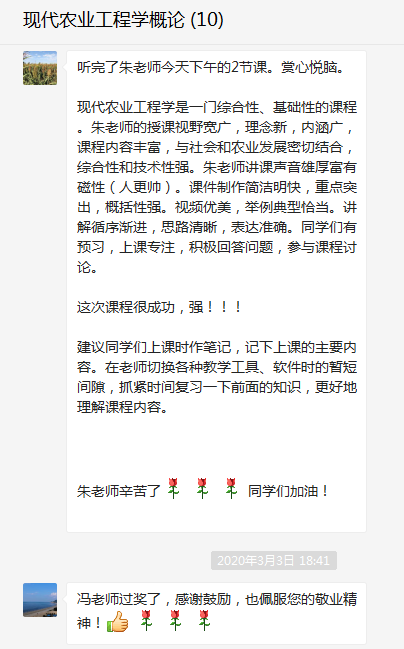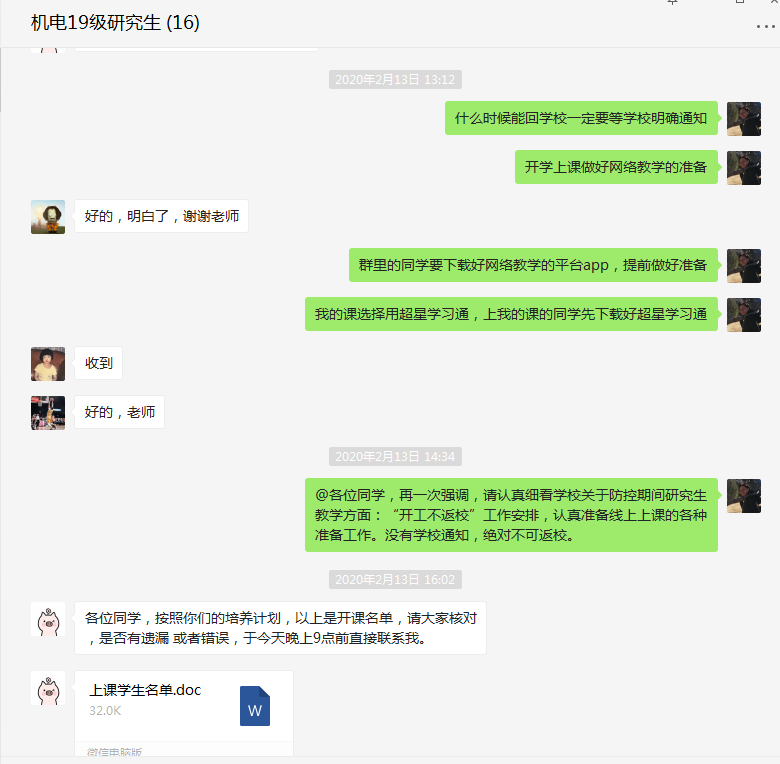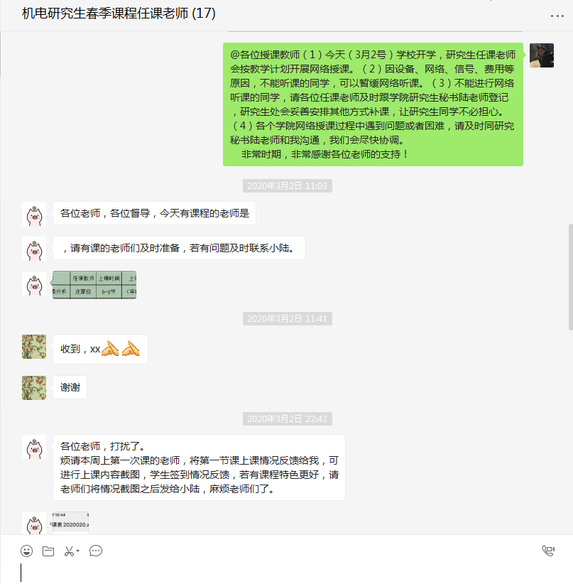 操作实施,网络授课进展顺利。学院共开设研究生课程11门,自3月2号以来,课程顺利有序进行。在实际教学中,教师们还为可能出现的网络拥挤、卡顿现象制订了有效的备选方案,保证了网络授课的顺利开展。同学们网络学习态度认真,课后,同学们纷纷表示,在当前这一特殊时期,将积极配合老师教学,保障学习不间断;教学督导老师也对线上授课表示认可,并提出了相关建议和意见。