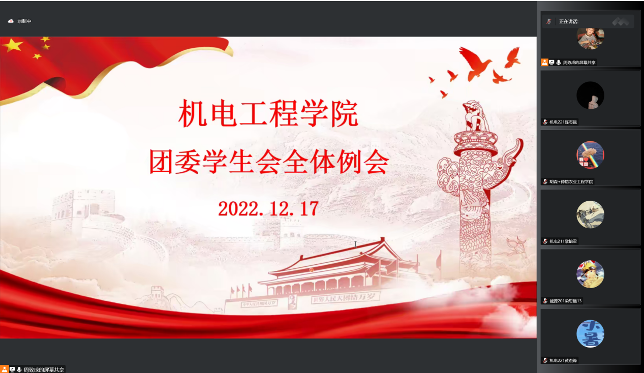 为及时总结本学期团委学生会各部门的工作情况及规划下学期的工作,促进学院团委学生会的各项工作高质量完成,2022年12月17日晚上,学院团委学生会以线上的形式召开全体工作人员例会。团委学生会指导老师胡森、李筱曼、校青马班成员、学院团委学生会全体成员参加本次会议。本次会议由周致成主持。