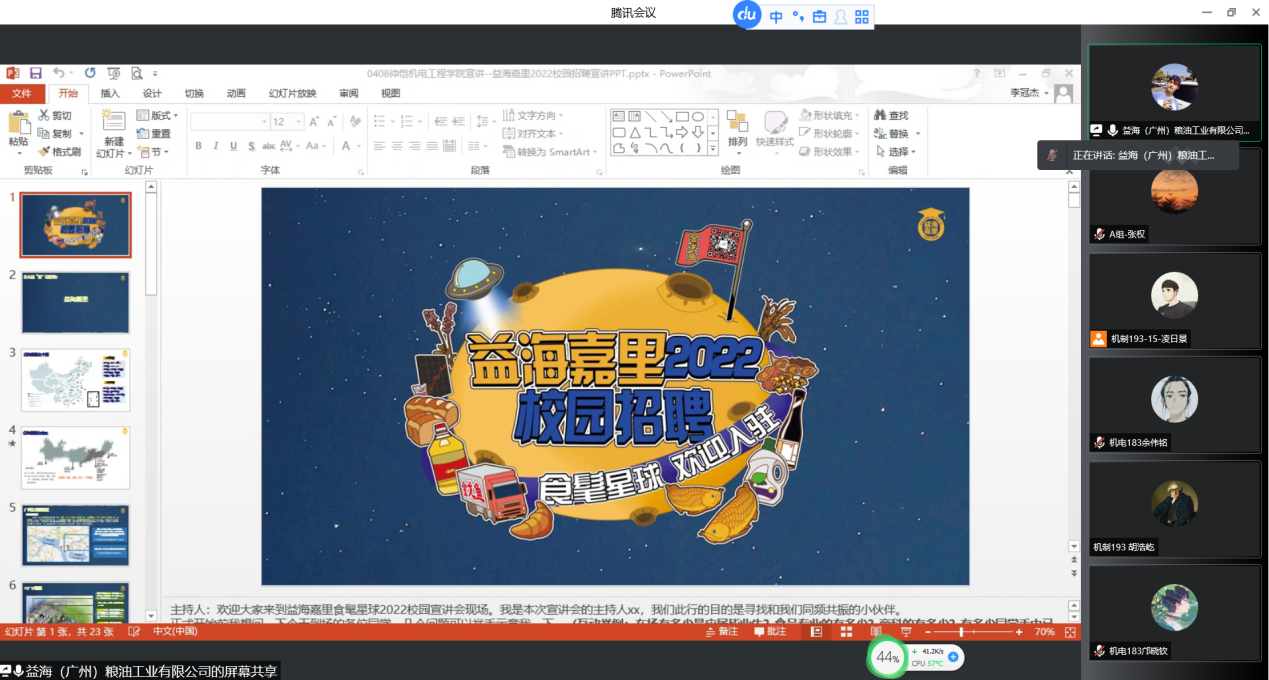 为贯彻落实党中央、国务院关于“稳就业”“促就业”的决策部署,做好当前疫情形势下毕业生的就业工作,充分调动毕业生就业积极性,帮助毕业生找到施展才华的舞台,3044am永利集团官网于4月8日下午在白云校区刘宇新楼202举办2022届毕业生线上招聘会。招聘会共有广州尚纳智能科技有限公司等20多家用人单位提供200多个优质岗位,其中中臣碧阳企业集团等12家用人单位参加宣讲。3044am永利集团官网学院党委副书记、院长丁力行,学院党委副书记何宝国,机电系主任白振伟,机制系主任李宁,毕业班班主任代表陈嘉澍、栗艳,毕业班辅导员田思参加本次会议。该院近300名学生线上参加。