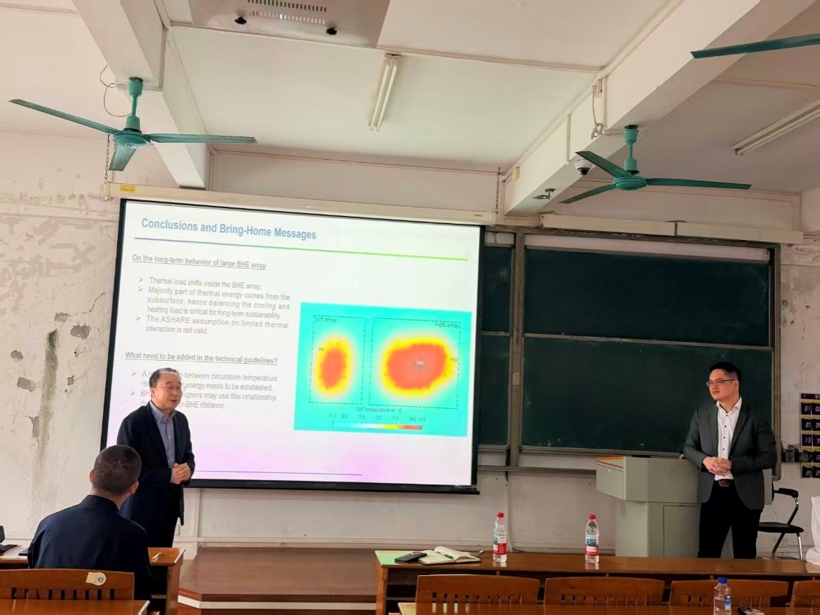 邵亥冰结合自己的研究领域和工作经历,以《OpenGeosys 软件在能源和环境问题研究中的应用》为题,为学院师生分享了一场受益匪浅的专业报告。报告分为两部分。第一部分,邵博士介绍了OpenGeosys软件在地源热泵技术中的应用,该软件可以精确模拟土壤中地下换热器周围的温度场演化过程,计算换热量并分析相关的影响因素。第二部分,邵博士以自身参加中国西藏羊易地热田发电项目的经历为背景,介绍了典型高温水热型地热发电的相关技术现状以及存在的问题。报告深入浅出、资料详实、紧贴实际,给相关专业领域的师生极大的启发,也扩展了能源系教师的研究思路。在讨论环节,丁力行教授和邵博士就地源热泵技术的有关问题进行了深入交流。